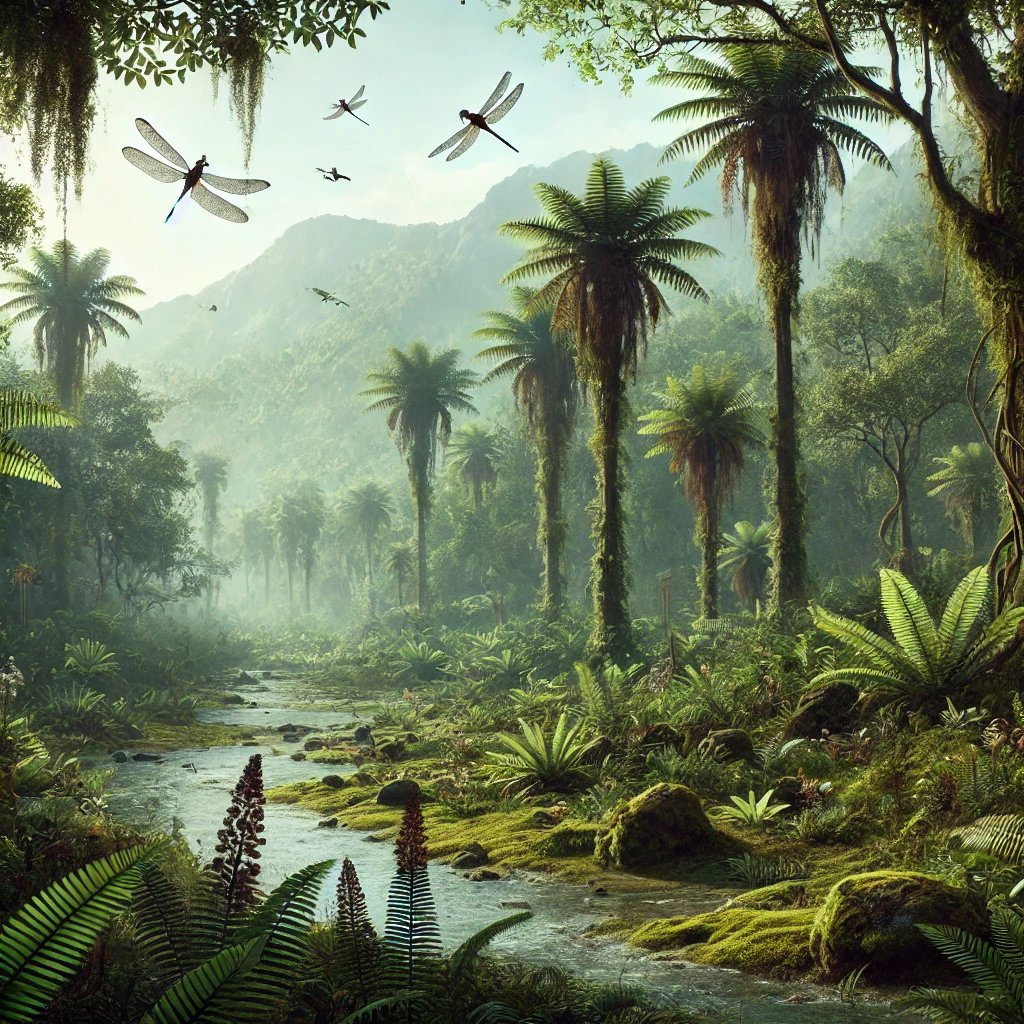 석탄기의 숲은 층위 구조가 매우 뚜렷했습니다. 지면에는 고사리류가 덮여 있었고, 그 위에는 칼라미테스와 같은 중간층 식물, 최상층에는 레피도덴드론과 시길라리아 같은 거대한 식물들이 우거져 있었습니다. 이러한 구조는 다양한 미기후를 형성하여 이끼류, 균류, 절지동물 등이 공존할 수 있게 했습니다. 이 생태계는 저산소 환경과 고이산화탄소 환경에 특화되어 있었고, 그 결과 당시 대기 중 산소 농도는 35%에 달하며 지금보다 훨씬 높았습니다. 이는 곤충의 거대화, 생분해 지연 등 독특한 생태적 현상을 유발했고, 식물 잔해물의 축적으로 인한 석탄 형성에도 직결되었습니다.