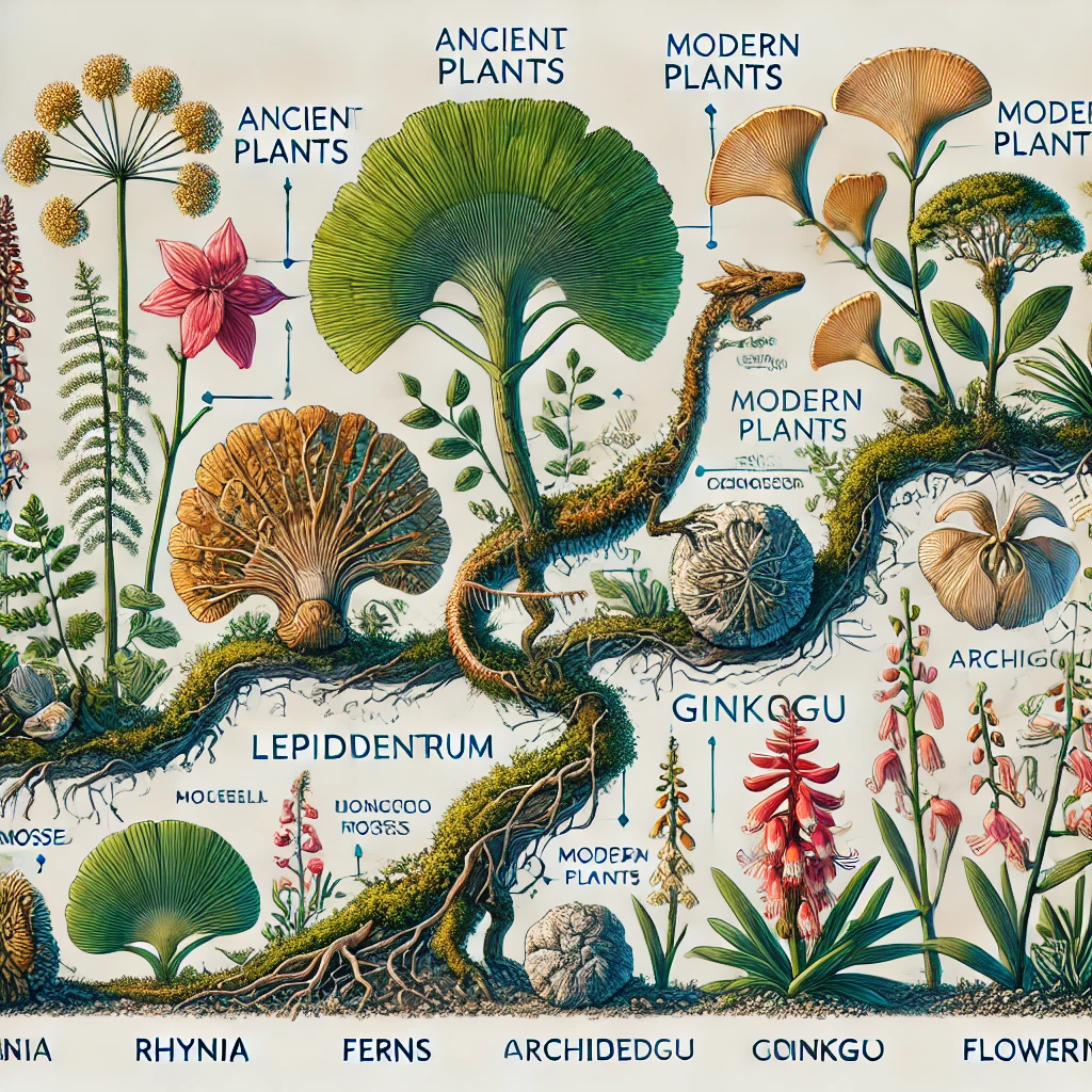 - Rhynia, Cooksonia와 같은 초기 육상 식물 화석은 현대의 이끼류와 양치식물의 조상으로 간주됩니다. - 이들은 뚜렷한 뿌리 없이 간단한 줄기 구조를 가지고 있으나, 관다발 조직이 출현했다는 점에서 오늘날의 고등 식물로의 진화를 알리는 신호탄이 됩니다. - 유전적 분석을 통해 현대 양치식물과의 공통된 DNA 마커가 일부 복원됨.