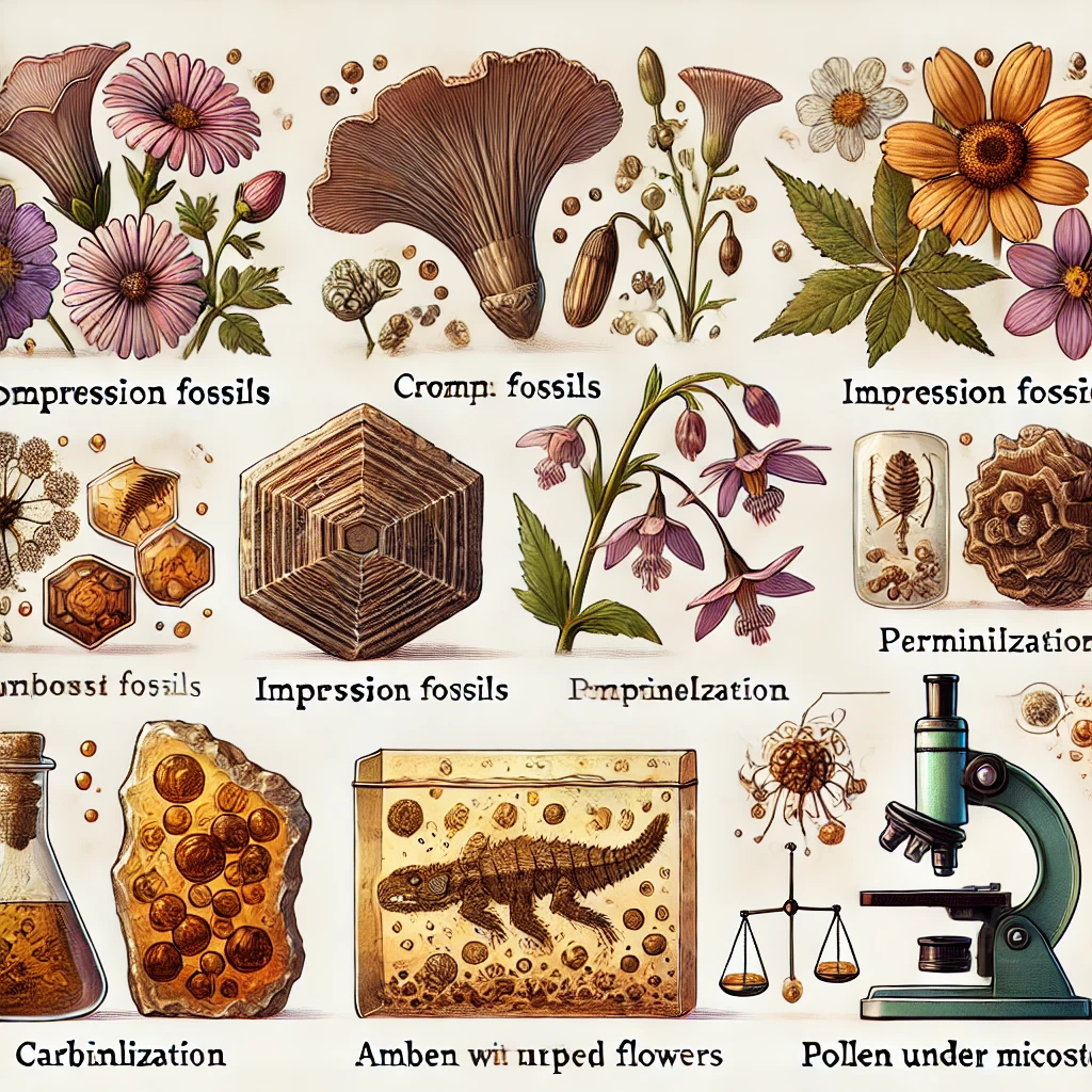 - 정의: 식물의 꽃가루(화분), 포자 등이 지층 내에 포함되어 장기간 보존된 것 - 주요 특징: 지질시대 구분, 고기후 분석, 생태계 변화 감지에 필수 - 형성 조건: 저산소성, 약한 산성 퇴적층, 점토 또는 석회성 환경 - 대표 사례: 에오세~올리고세 유럽 퇴적지, 중국 및 한국의 신생대 지층 이러한 보존 방식은 독립적으로 나타나기도 하지만, 동일 지층 내에서 복합적으로 나타나는 경우도 많습니다. 하나의 식물 부위는 압착 화석으로, 다른 부위는 치환 화석으로 남을 수 있으며, 같은 지역의 호박 안에는 당시의 꽃과 화분이 함께 포획되기도 합니다.