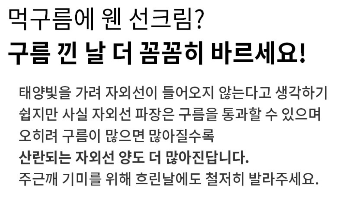 오히려 구름이 많을수록 자외선이 산란되면서 더 강하게 피부에 침투해요.